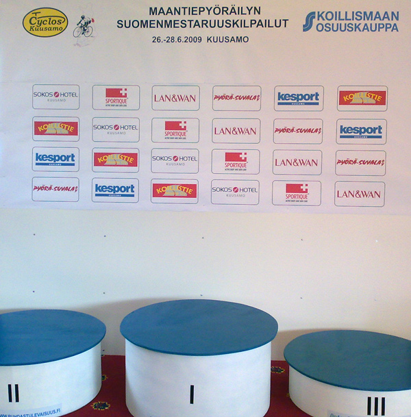 Kilpailukeskus on valmis ottamaan vastaan kilpailijat huoltojoukkoineen. Niin on myös Kuusamosalin palkintopalli. Uusia mestareita odotellessa ja veikkaillessa voi muistella, miten viime kesänä kilpailtiin Cyclos-tempon ja Kuusamon Kapusta-ajon merkeissä (linkki arkistosivuille).